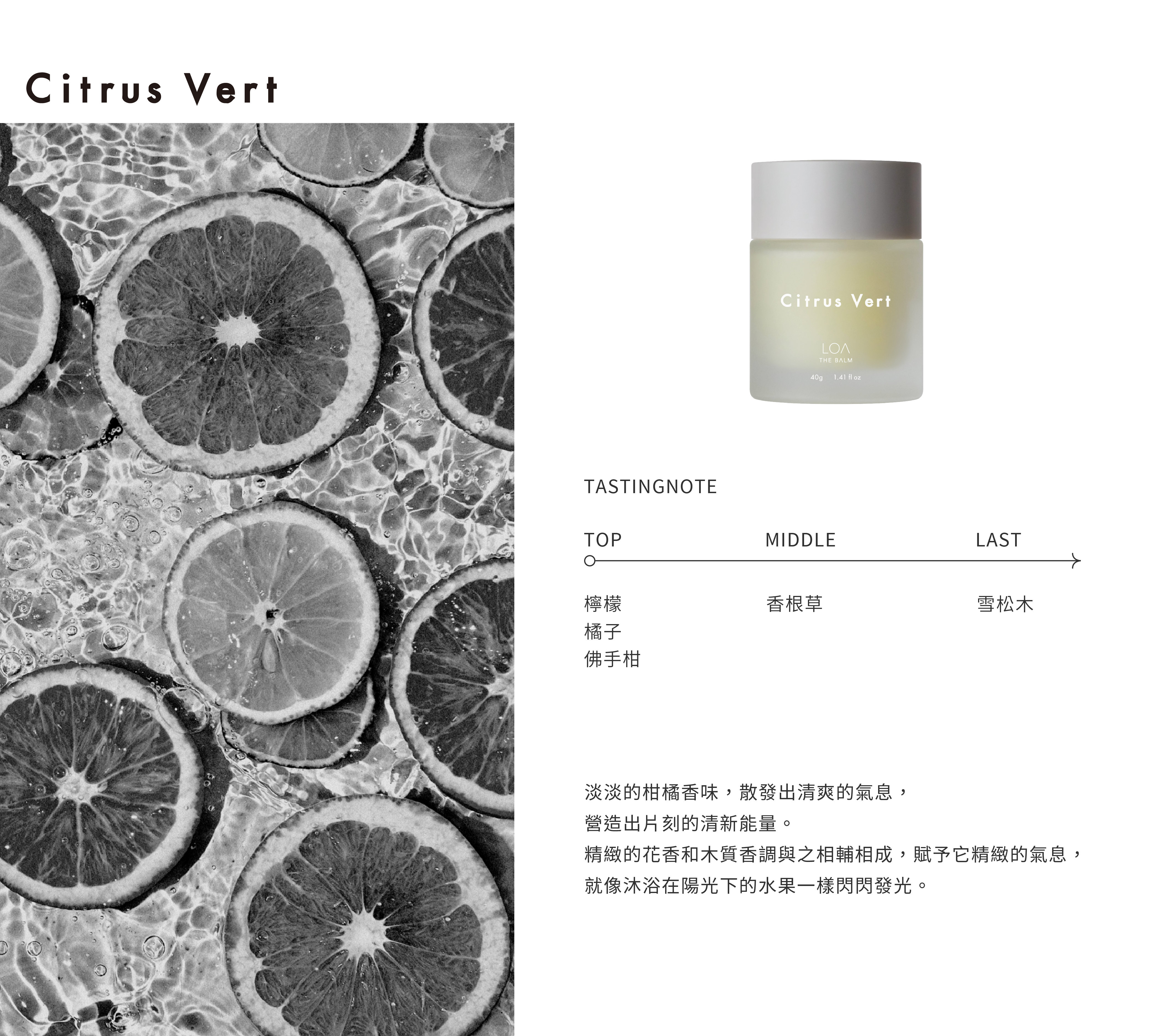 淡淡的柑橘香味,散發出清爽的氣息,營造出片刻的清新能量。