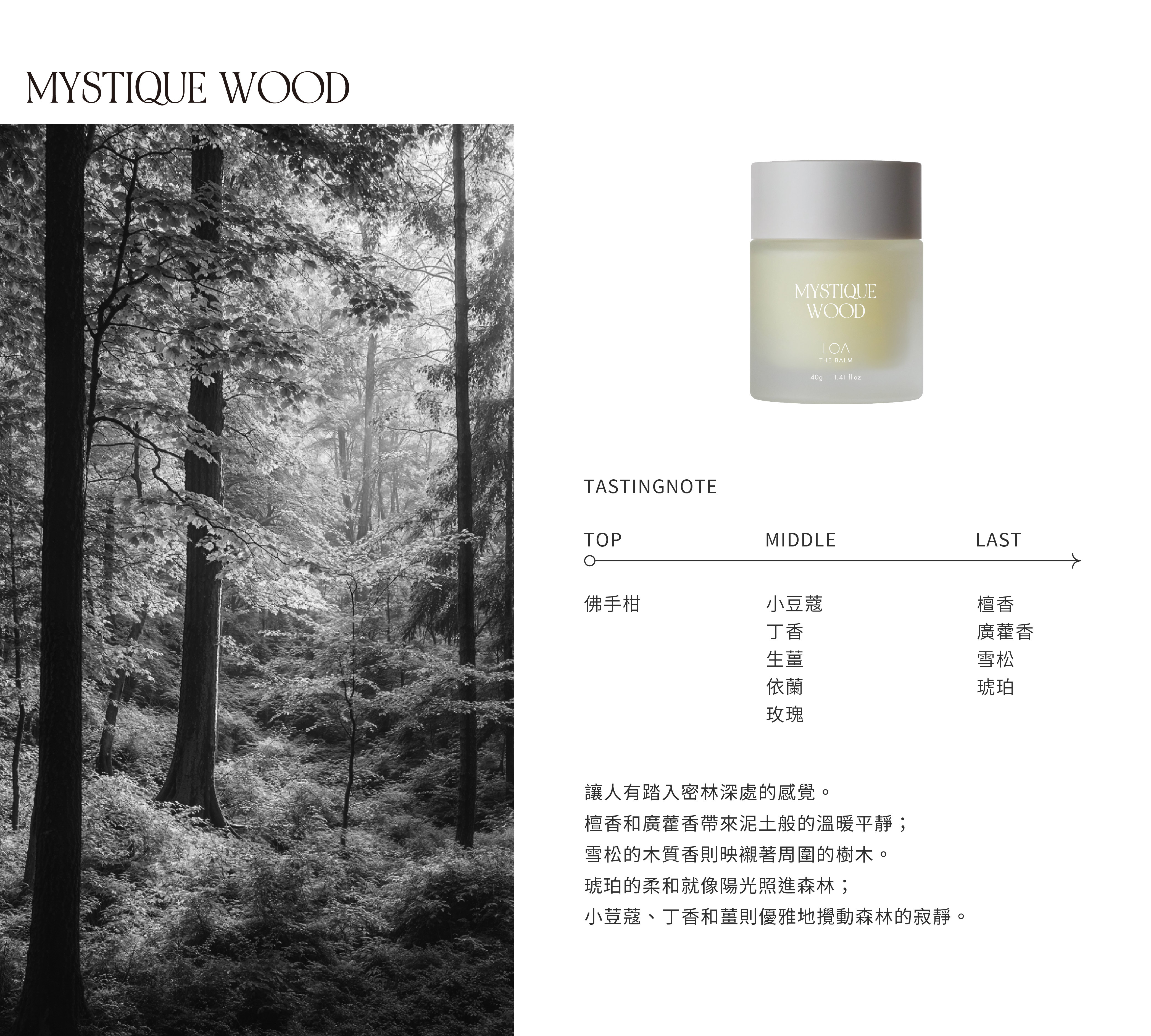 檀香和廣藿香帶來泥土般的溫暖平靜;雪松的木質香則映襯著周圍的樹木。